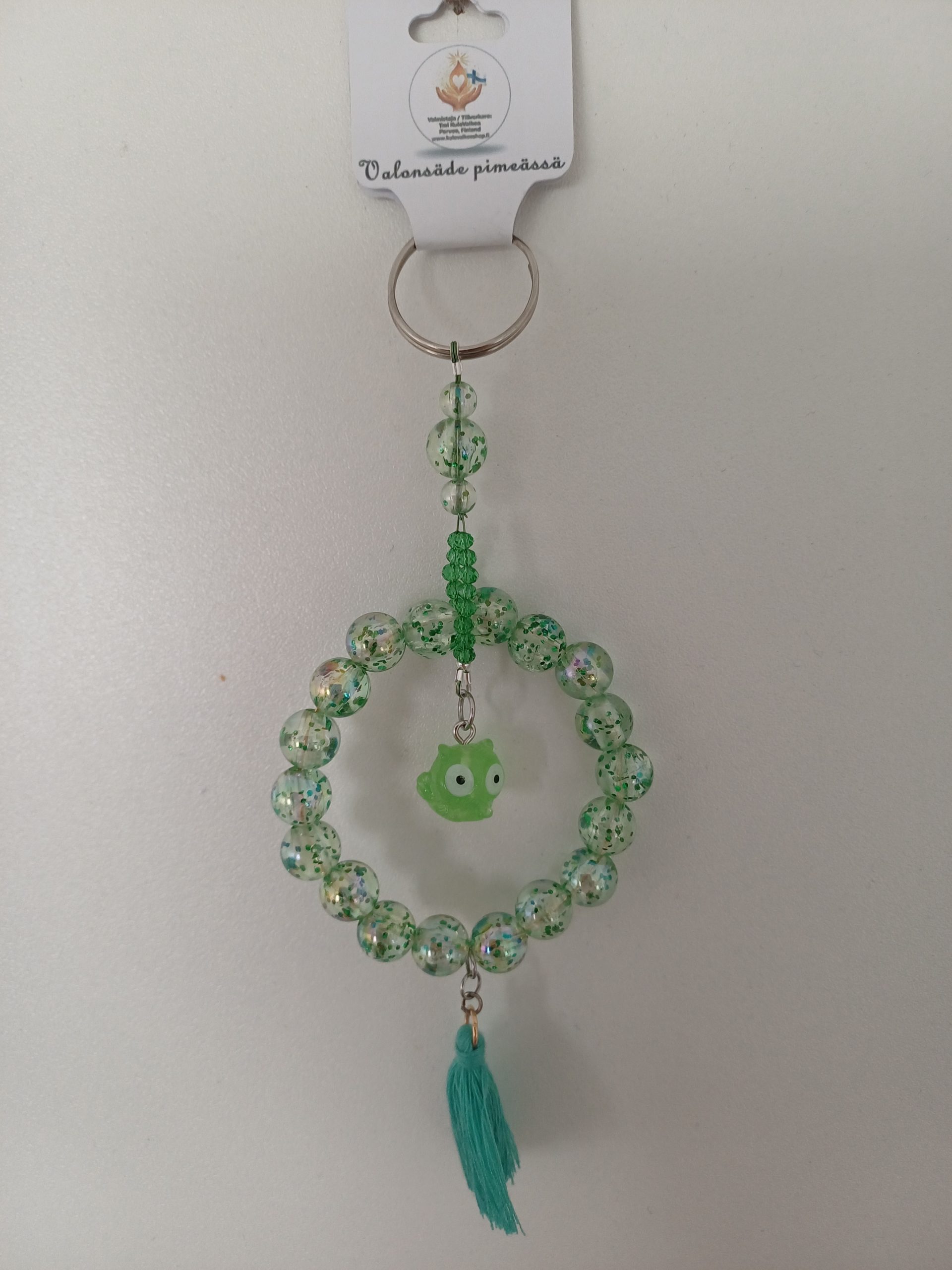 Tämä käsintehty Onnenpöllö on näyttävä ja leikkisä asuste, joka on luotu piristämään niin reppua, käsilaukkua kuin kodin sisustustakin. Kimmeltävät glitter-helmet ja sympaattinen pöllöhahmo tekevät tästä täydellisen lahjaidean tai piristyksen itselle.
